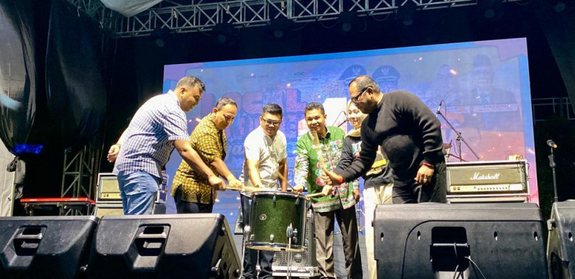 Wakil Bupati Kutim, Kasmidi Bulang (kaos hitam) saat menabuh gendang tanda dibukanya Local Market Sangatta 2023. (Istimewa)