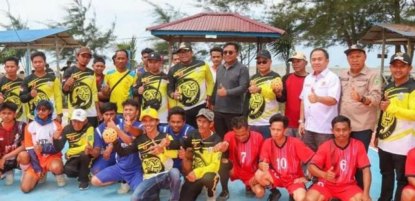 Foto Bersama Wabup Kutim Kasmidi Bulang Bersama Panitia dan Peserta Kejuaraan Sepak Takraw PSTI 2023 Dengan Latar Pantai Marang Kaliorang