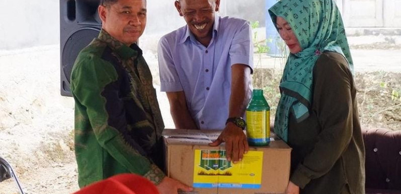 Ketua DPRD Kutim, Joni (kiri), saat melakukan penyerahan bantuan racun rumput kepada petani.