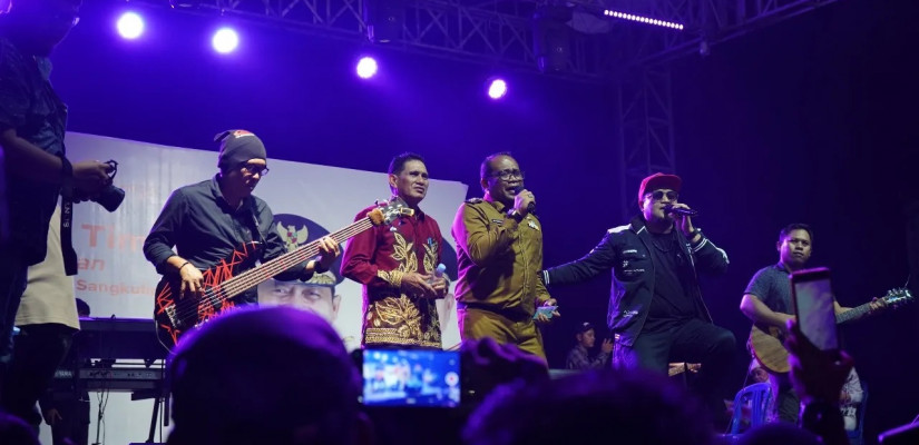 Wabup Kasmidi langsung berbaur dengan ribuan warga Sangkulirang yang memadati area panggung. Ia menyanyikan lagu Bintang dengan penuh semangat dan disambut gegap gempita oleh warga.