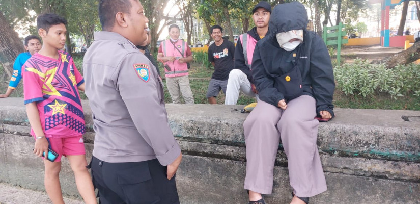 DIBUJUK - DW (jaket hitam) mahasiswi yang nyaris mengakhiri hidupnya dengan terjun ke Sungai Mahakam di tepian depan Masjid Islamic Centre Samarinda, Rabu (20/9/2023), saat dibujuk oleh pihak kepolisian dan warga setempat. POLSEK SUNGAI KUNJANG