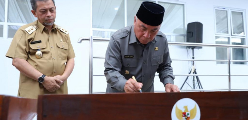 TANDATANGANI PRASASTI - Gubernur Isran Noor saat menandatangani prasasti tanda diresmikannya gedung yang telah selesai dilakukan pembangunan di dampingi Wagub Hadi Mulyadi beserta jajaran Pemprov Kaltim, Selasa (26/9/2023)