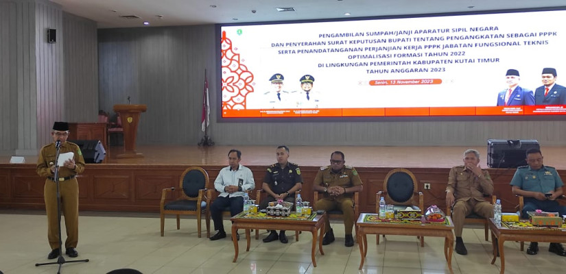Sangatta, Afiliasi.net - Bupati Kutai Timur (Kutim) Ardiansyah Sulaiman melantik dan mengambil sumpah/janji 586 Aparatur Sipil Negara (ASN) dan 84 Pegawai Pemerintah dengan Perjanjian Kerja (PPPK) di Ruang Akasia, Gedung Serba Guna (GSG), Bukit Pelangi, Kutim, Senin (13/11/2023).