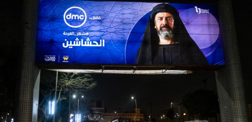 Sejumlah kendaraan bergerak melintasi papan iklan yang menampilkan promo dari serial televisi asal Mesir "al-Hashashin" (Sang Pembunuh) yang terpasang di jalanan Heliopolis di Kairo, Mesir, pada 3 Maret 2024. (Foto AFP/Amir Makar)