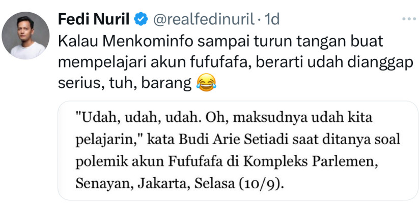 Sebelumnya, Fedi juga sempat menulis mengenai akun tersebut yang terus menjadi perbincangan di media sosial. "Fufufafa masih trending aja. Apakah ada yang punya info soal ini?" cuitnya.