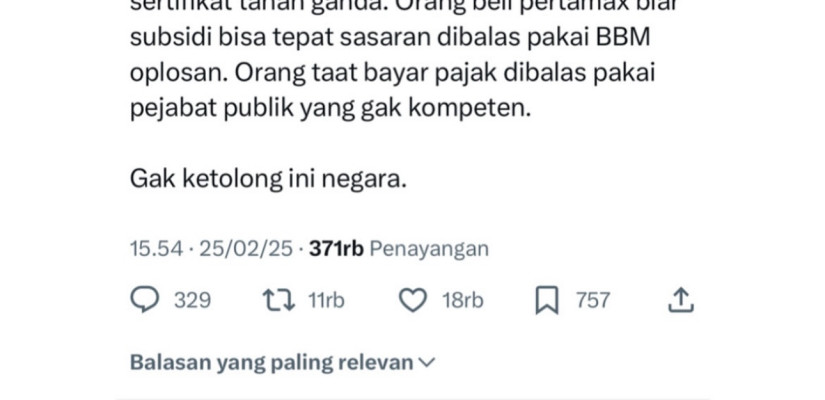 Sementara itu, akun @The_RedsIndo melontarkan kritik pedas terhadap kondisi di Indonesia. “Di Indonesia, orang taat bayar PBB dibalas pakai sertifikat tanah ganda. Orang beli Pertamax biar subsidi bisa tepat sasaran dibalas pakai BBM oplosan. Orang taat bayar pajak dibalas pakai pejabat publik yang gak kompeten. Gak ketolong ini negara,” tulisnya.