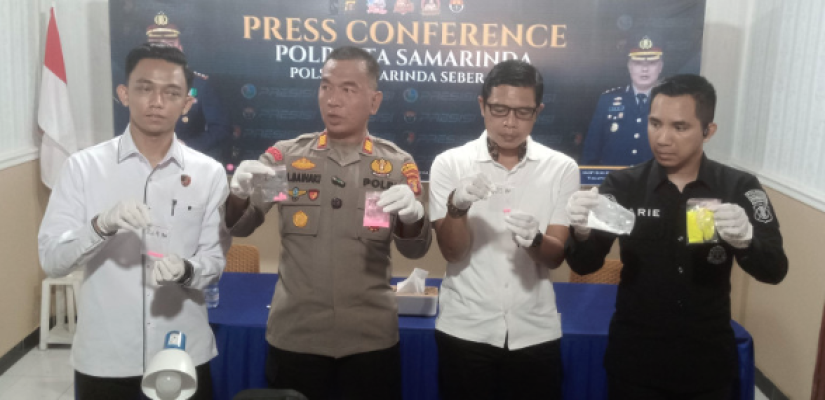 Polsek Samarinda Seberang saat merilis kasus aboratorium rumahan (clandestine laboratory) yang beroperasi di wilayah Samarinda Seberang dan Samarinda Kota. (Istimewa)