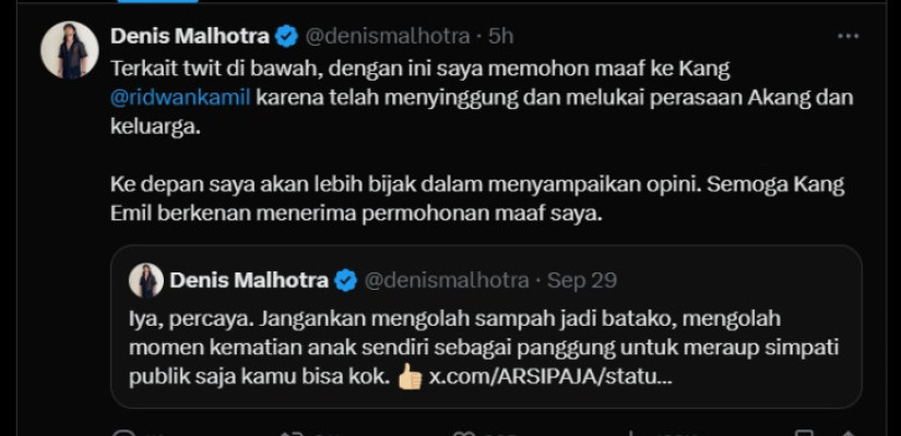 Ridwan Kamil Tanggapi Cuitan Kontroversial Denis Malhotra, Minta Hentikan Bullying Terhadap Keluarga
